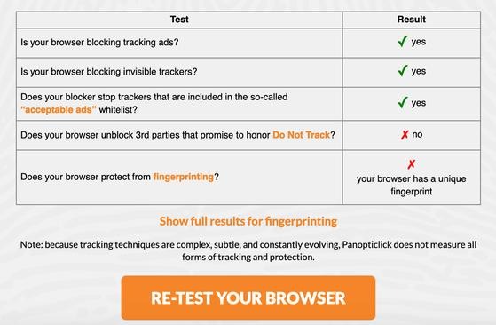 Theo thử nghiệm, trình duyệt Firefox gần như chặn được các trình theo dõi (như kết quả bên dưới). Lưu ý, vì các kỹ thuật theo dõi rất phức tạp, tinh tế và không ngừng phát triển, do đó Panopticlick không thể đo lường được tất cả các hình thức theo dõi.