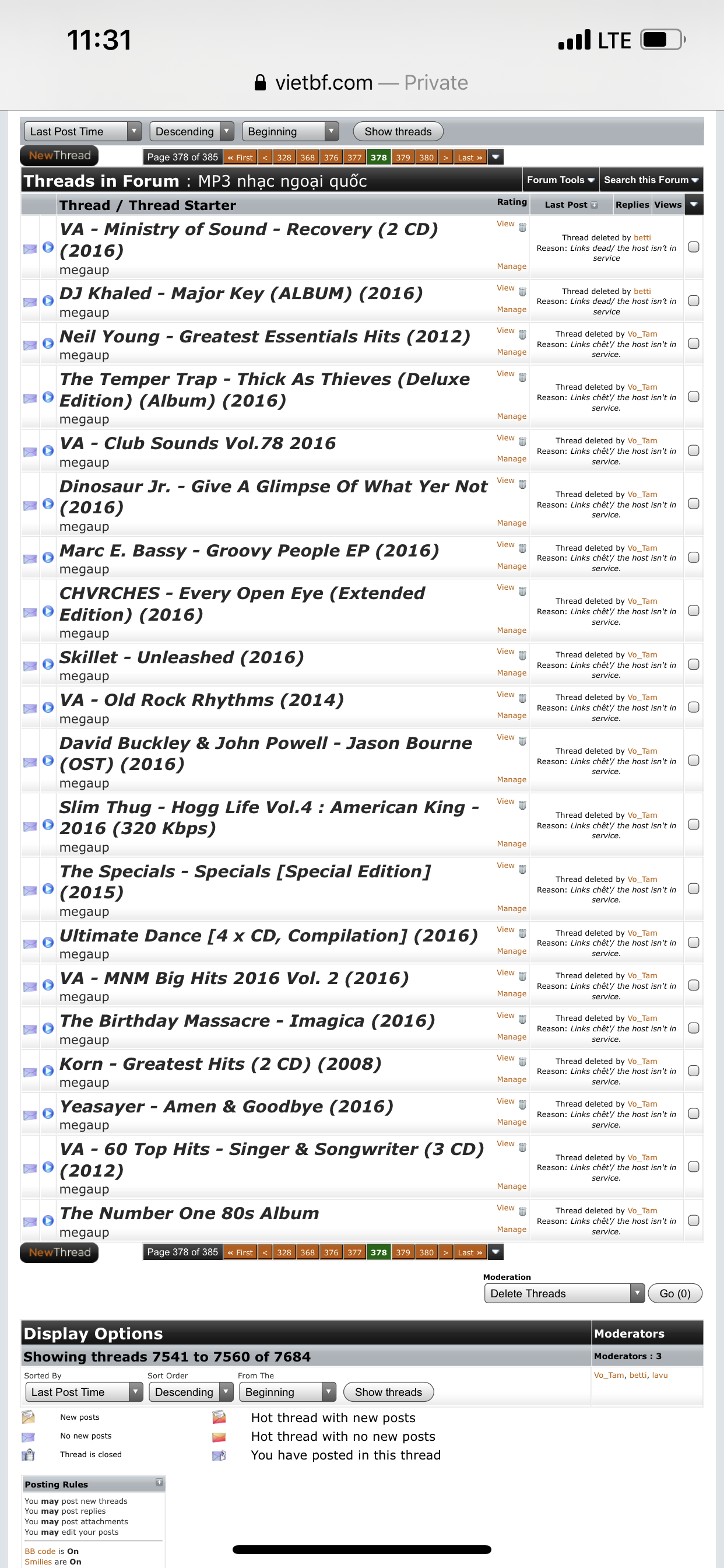 1) Mod phòng nhạc chỉ có tôi, betti và Lavu. Chúng tôi chỉ là Mod nhí ko thể nào xoá bài mất dấu vết. Người có chức năng xoá ngoại trừ Mod cụ là Lavu, và Admin, bác Gibbs. Nhưng Admin, bác Gibbs họ không có rảnh mà vào xoá topic của tôi. Vì nếu muốn làm vậy thì Admin chỉ cần BAN nick tôi thay vì xoá topic tôi và để tôi làm Mod phòng nhạc MP3 làm gì.