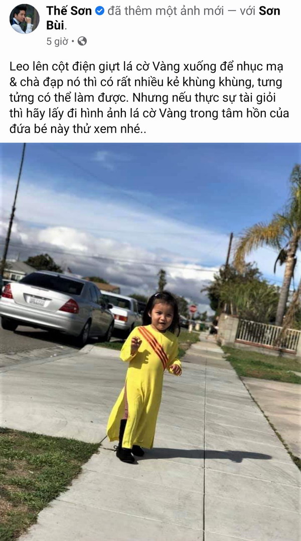 "Leo lên cột điện giựt lá cờ Vàng xuống để nhục mạ & chà đạp nó thì có rất nhiều kẻ khùng khùng, tưng tửng có thể làm được. Nhưng nếu thực sự tài giỏi thì hãy lấy đi hình ảnh lá cờ Vàng trong tâm hồn của đứa bé này thử xem nhé.." Danh ca Hải Ngoại nam ca sĩ Thế Sơn chia sẻ cảm nghĩ của mình trên trang cá nhân.