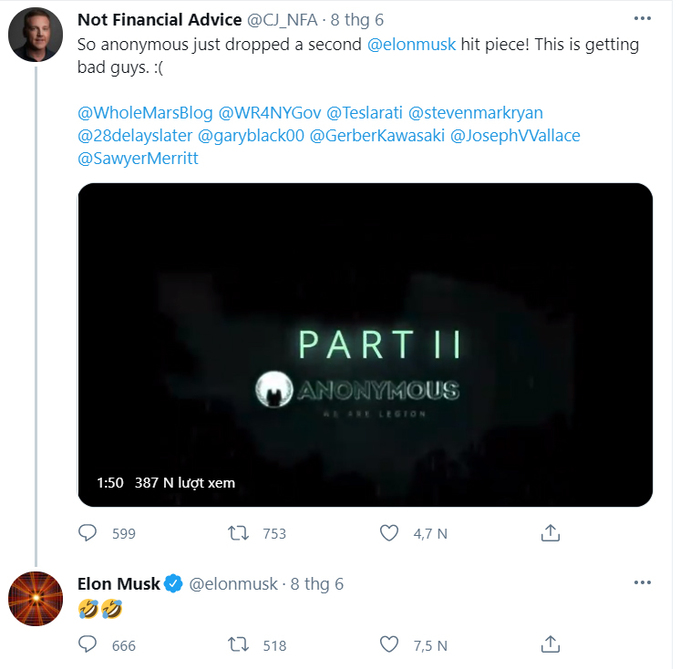 Elon Musk đăng hai biểu tượng cảm xúc "cười ra nước mắt" dưới một video giả mạo nhóm Anonymous.