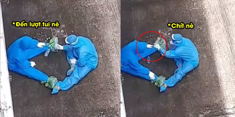 Nhân viên y tế 'tung hứng' giải khuây. Tranh thủ lúc giải lao, hai nhân viên y tế chơi tṛ tung chai nước để xả stress. Dịch bệnh mau kết thúc để mọi người được trở về cuộc sống b́nh thường.