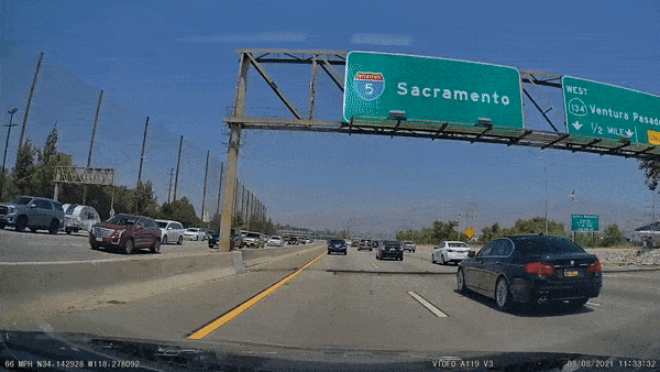 Chiếc BMW series 5 vọt lên và chen vào giữa hai xe cùng chiều rồi mất lái, đâm vào cả hai bên, hôm 8/8 ở Los Angeles.
