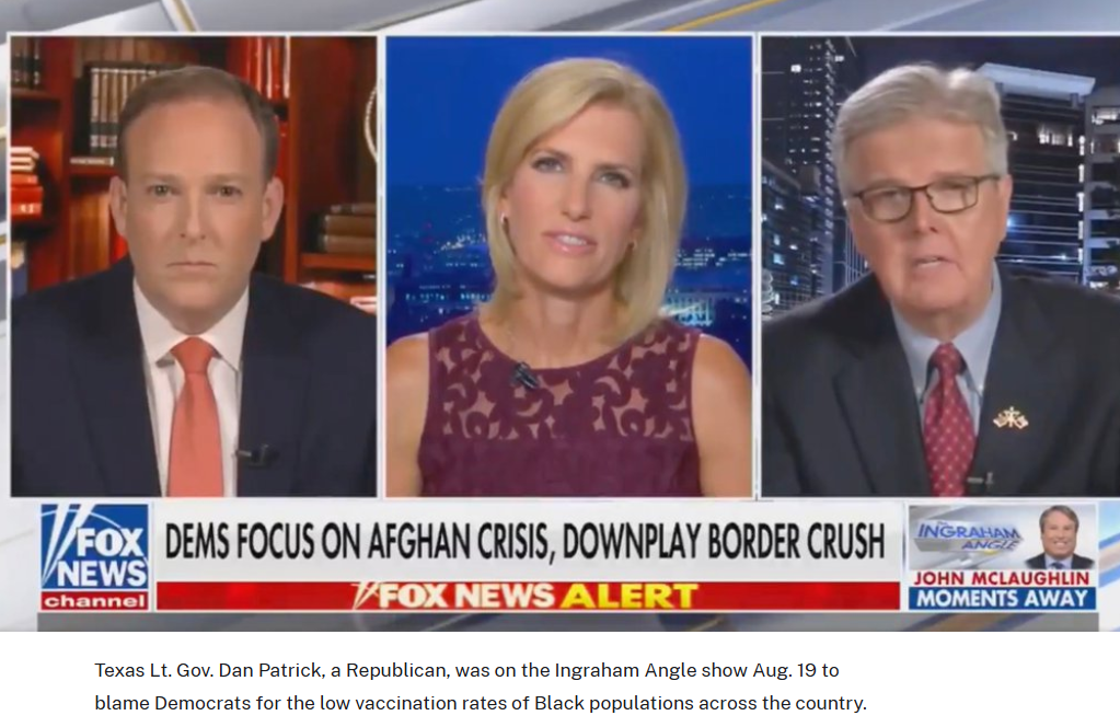 In an attempt to blame vaccine hesitancy on Democrats, Patrick said on Fox News that the biggest group of unvaccinated people in most states is African Americans. He later clarified his statement, saying that he was referring to vaccination rates, not total populations.