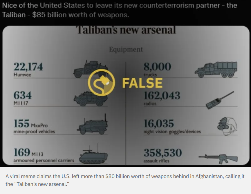 One persistent claim is that the Taliban captured more than $80 billion worth of American military equipment. This is not true.
