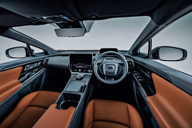 Hai bên thân xe, Subaru Solterra tạo nên sự khác biệt với mẫu bZ4X bằng các đường gờ nổi và hõm khoét trên thân và ốp đuôi xe. Bên cạnh đó, vòm bánh xe cũng đi kèm tấm ốp màu đen tương phản. Khoang nội thất gần như không có sự khác biệt so với mẫu xe Toyota bZ4X, màn hình giải trí cảm ứng được bố trí thấp, bảng đồng hồ kỹ thuật số được đẩy lên khá cao.