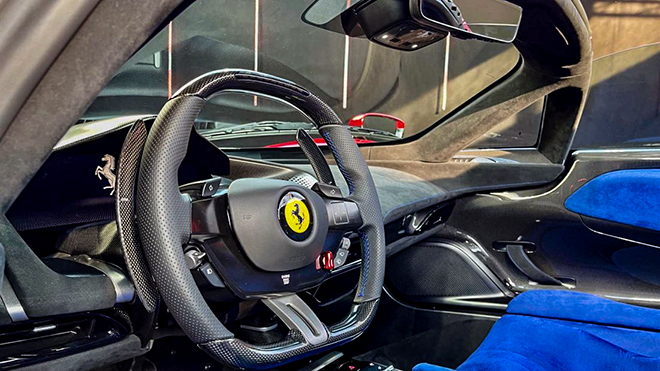 Bảng táp-lô được bọc da lộn. Màn hình trung tâm có kích thước 16 inch, được uốn cong đẹp mắt. Vô-lăng vẫn là loại vô-lăng với các nút bấm dạng cảm ứng như trên Ferrari SF90, một chi tiết khác tương tự như SF90 đó là các nút chuyển số ở bảng điều khiển trung tâm.
