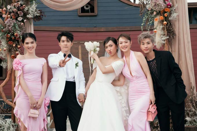 Mai Phương Thúy cũng được cho là gợi cảm, lấn át cả cô dâu khi diện chiếc váy hồng màu nude, có thiết kế cúp ngực.