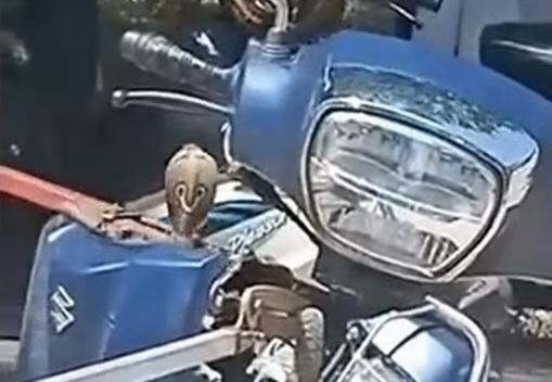 Một người đàn ông sống tại Thành phố Thanjavur, Ấn Độ, đã có một phen thót tim khi nhìn thấy một con rắn hổ mang thò đầu ra khỏi chiếc xe máy của mình.