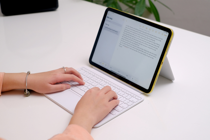 Thử nghiệm bàn phím Magic Keyboard Folio trên iPad Gen 10 cho thấy cảm giác gõ tốt với độ nảy phù hợp dù hành trình phím ngắn. Phím kiểu chiclet kích thước nhỏ nhưng dễ làm quen, gõ văn bản trong thời gian dài ít gây mỏi. Với phụ kiện này, người dùng có thêm một chân đỡ màn hình phía sau kiêm vỏ bảo vệ máy. Dù thêm bàn phím vật lý, iPad vẫn nhỏ gọn hơn nhiều so với laptop.