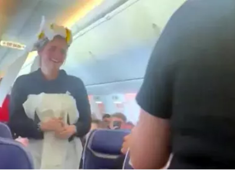 Các hành khách trên chuyến bay vỗ tay chúc phúc cho cặp đôi sắp cưới. Trong khi đó, một số người khác quay video để chia sẻ khoảnh khắc đặc biệt.