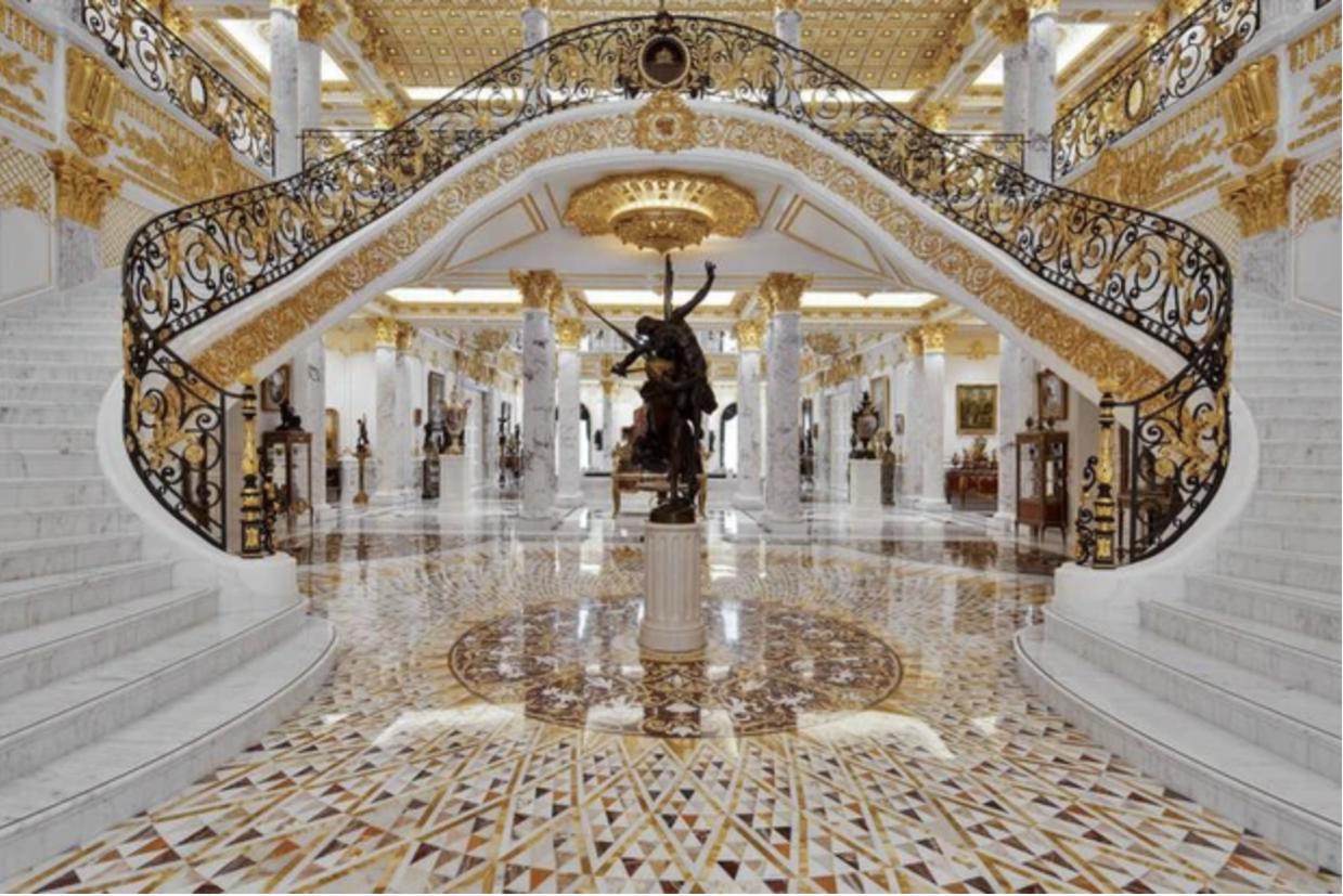 Được mệnh danh là Cung điện Cẩm thạch, ngôi biệt thự này được chính 70 nghệ nhân lành nghề dành hơn 9 tháng để dán thủ công hơn 700.000 lá vàng lên toàn bộ căn nhà.