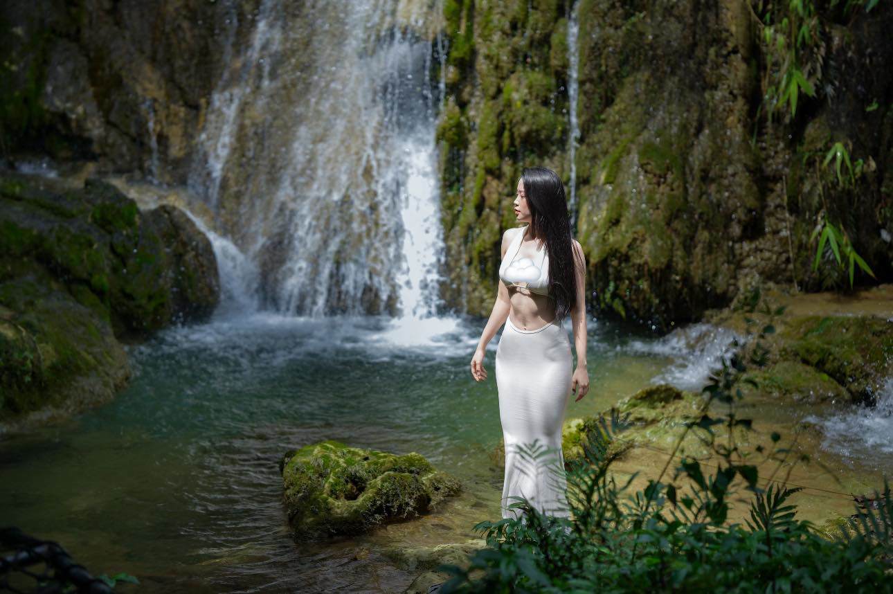 Old  Default Nữ MC tôn đường cong như vẽ khi diện đầm táo bạo bên thác nước