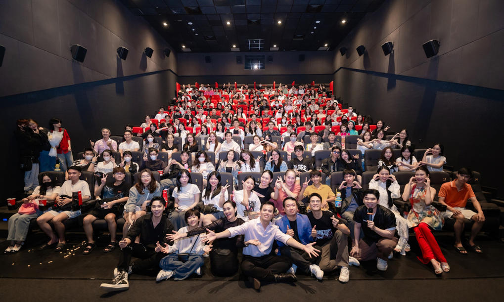 Êkíp "Cám" (hàng đầu) giao lưu cùng khán giả cuối tuần tại TP HCM. Ảnh: Production Q