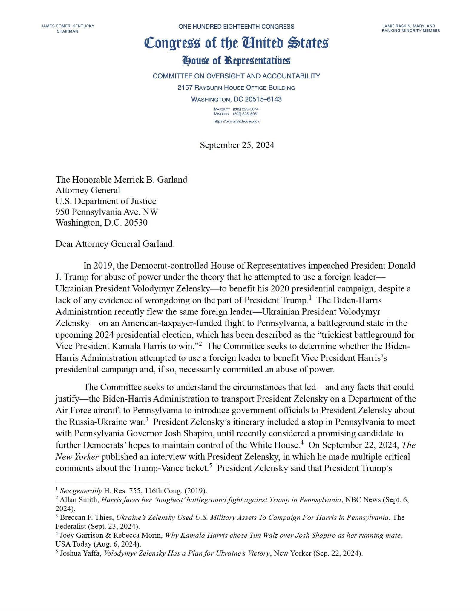 - Chủ tịch ủy ban minh bạch, James Comer gởi công văn đến bộ tư pháp, quốc phòng và Bạch Ốc yêu cầu điều tra việc Chính quyền Biden-Harris sử dụng nguồn tài chánh từ người nộp thuế để đưa Tổng thống Ukraine ,Zelensky đến Pennsylvania để vận động cho Kamala Harris . Nếu Chính quyền Biden-Harris sử dụng một nhà lãnh đạo nước ngoài để mang lại lợi ích cho chiến dịch tranh cử tổng thống của Camala thì đây là hành vi lạm dụng quyền lực và sử dụng sai mục đích tiền thuế của người dân .Hình