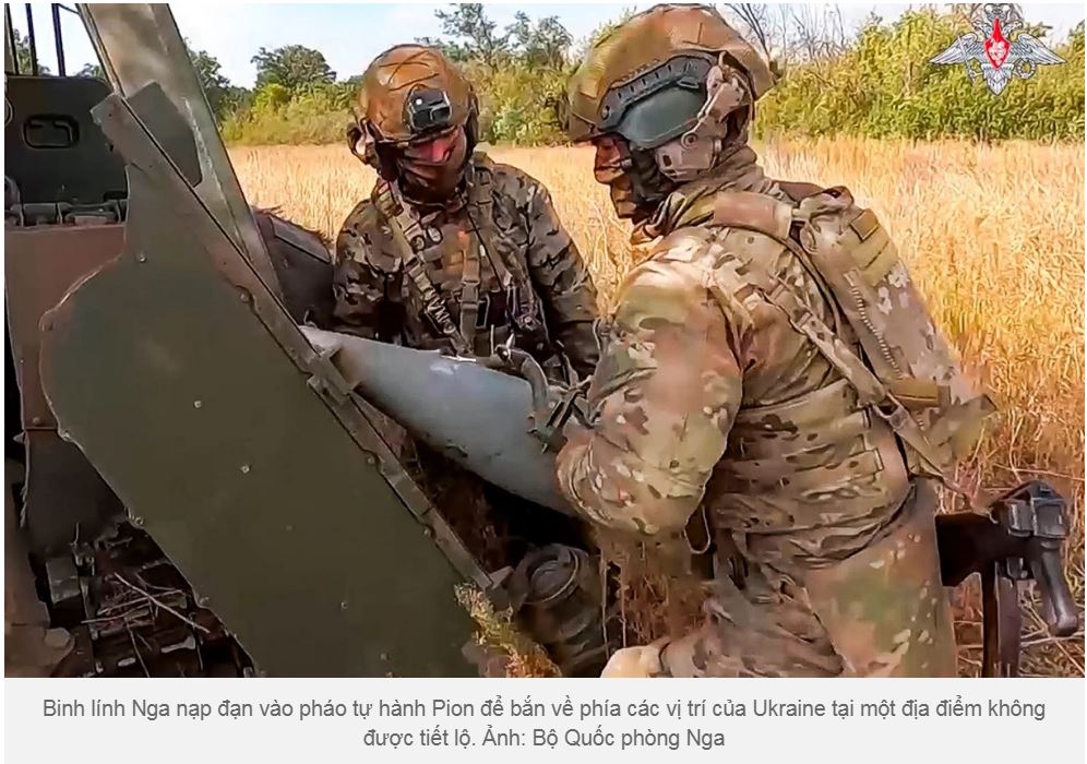 Binh lính Nga nạp đạn vào pháo tự hành Pion để bắn về phía các vị trí của Ukraine tại một địa điểm không được tiết lộ. Ảnh: Bộ Quốc phòng Nga