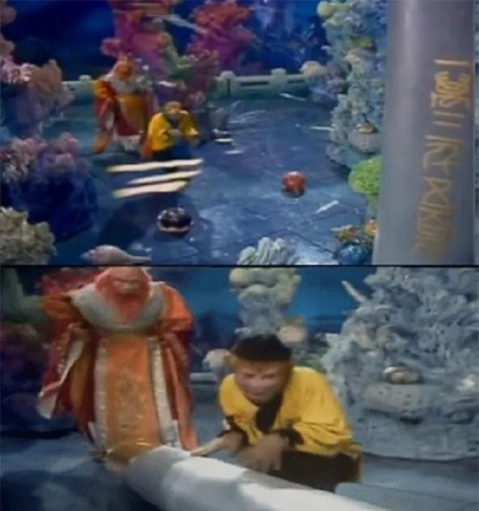 Nghe lời con khỉ già, Tôn Ngộ Không đă đi theo mật đạo trong Thủy Liêm động để đến Long cung hỏi mượn binh khí của Đông Hải Long Vương. Dù gặp mặt lần đầu nhưng nhận thấy con khỉ trước mặt không phải nhân vật tầm thường, Long Vương liền nhiệt t́nh giới thiệu đủ thứ vũ khí lợi hại. Tuy nhiên, không món nào làm vừa ḷng Tôn Ngộ Không. Đến khi Long Vương dắt hắn tới thăm cây Định Hải Thần Châm ở đáy biển, Tôn Ngộ Không cực ḱ hài ḷng khi cây cột sắt này dễ dàng thu nhỏ, phóng to tùy ư của hắn.