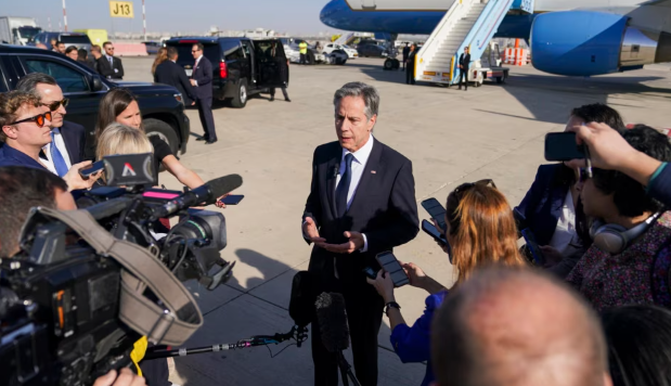Ông phát biểu như vậy trước khi rời Israel đến Ả Rập Xê Út trong chuyến thăm thứ 11 tới khu vực này kể từ khi chiến tranh nổ ra. Tiếng còi báo động không kích đã vang lên ở Tel Aviv ngay trước khi ông Blinken rời đi, khi Israel đánh chặn hai quả đạn được bắn từ Lebanon, và có một luồng khói bốc lên trời từ khách sạn của ông Blinken.