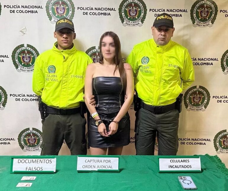 Carolina Mejía Montoya bị bắt với hai thẻ căn cước khác nhau. Ảnh: Policía Metropolitana del Valle de Aburrá