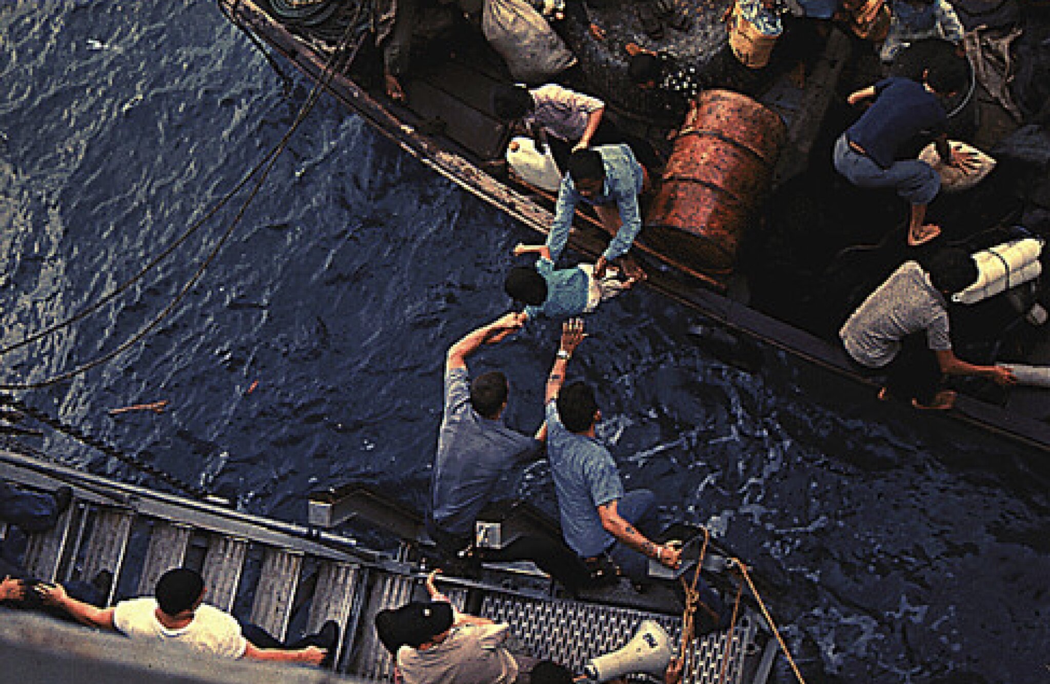 Cảnh thuyền nhân Việt được chiến hạm USS Durham cứu vớt. (Hình: USNA)
