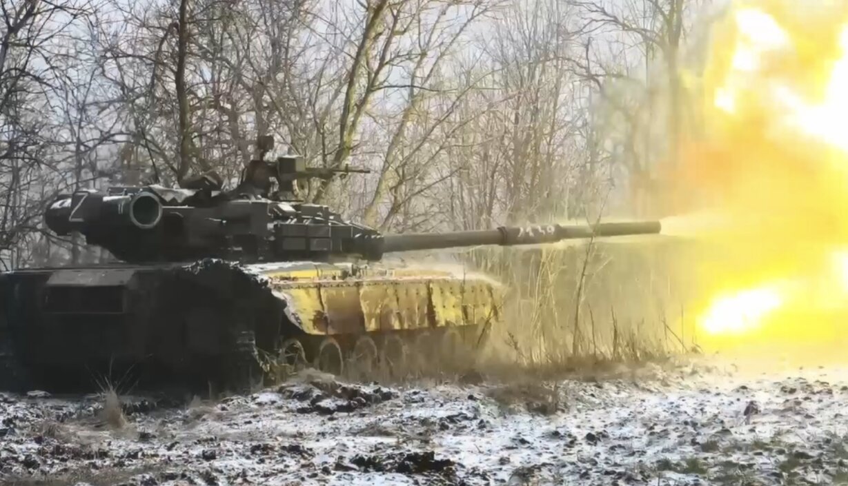 Xe tăng T-80 của Nga nã pháo về phía xe thiết giáp Ukraine. Ảnh: Military ops.
