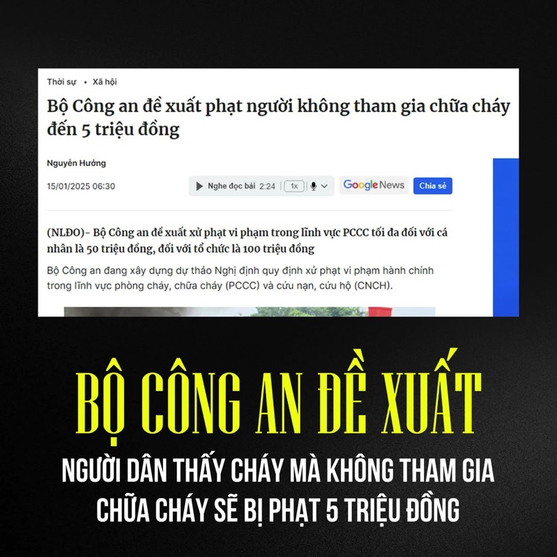 Nếu như các nước phát triển khuyên người dân khi gặp cháy trước tiên phải bảo vệ tính mạng của bản thân, sau đó gọi điện cho cảnh sát. Thì Bộ Công an Việt Nam lại ép những người dân không có kiến thức, không được đào tạo nghiệp vụ, không có trang bị phương tiện, dụng cụ chữa cháy phải lao vào nguy hiểm tham gia chữa cháy. Trong khi đây là trách nhiệm của các cơ quan phòng, chữa cháy, cứu hộ, cứu nạn.