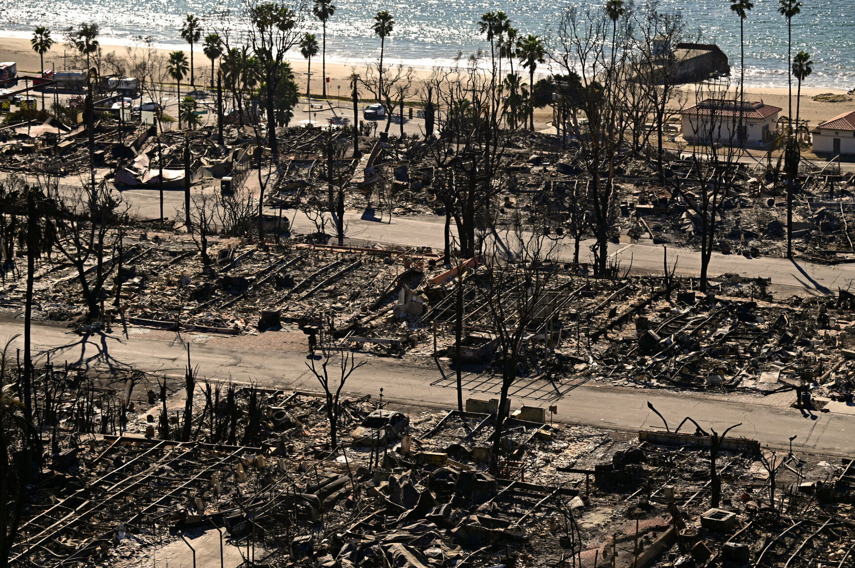 Quang cảnh nhà và xe bị cháy rụi ở vùng Pacific Palisades thuộc Los Angeles, California, ngày 13 tháng Giêng, 2025. (Ảnh: AGUSTIN PAULLIER/AFP/Getty Images)