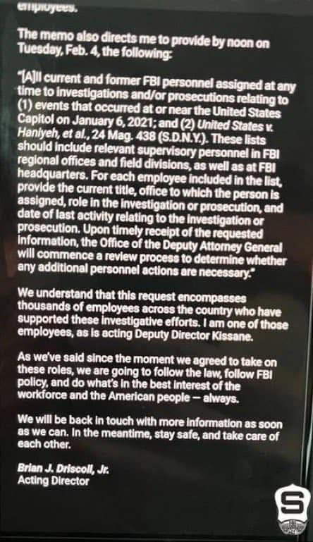 Trong bức thư này cho thấy, bộ tư pháp đòi Fbi phải cung cấp tất cả tin tức của các nhân viên làm việc trong vụ J6 kể cả các nhân viên đã nghỉ việc, chức vụ và tình trạng hiện tại trước 12 giờ ngày thứ ba 4 tháng 2/25.