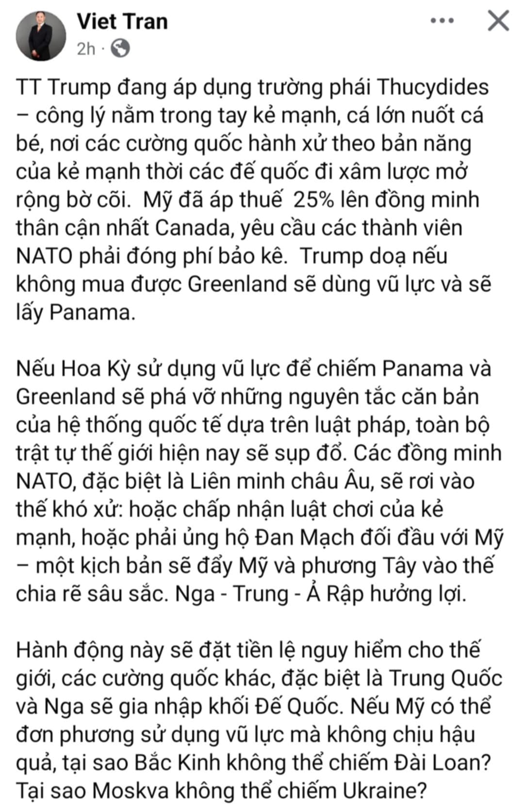 Vấn đề tổng thống Trump đánh thuế nhập khẩu Canada , Mexico 25%, và Trung Quốc 10%, không phải cá lớn nuốt cá bé theo trường phái Thucydides như luận điệu của thằng ku thiên tả trong hình ở dưới lý sự. Tui cũng dám khẳng định, rằng : KHÔNG BAO GIỜ CÓ CHIẾN TRANH THẾ GIỚI THỨ 3.