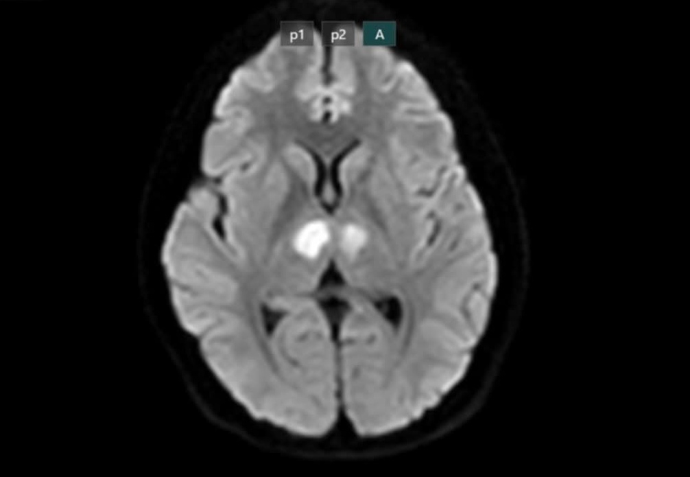 Kết quả chụp MRI cho thấy năo bệnh nhân có h́nh ảnh tổn thương vùng đồi thị hai bên. Gia đ́nh xin chuyển bệnh nhân sang Bệnh viện Bạch Mai để được tiếp tục điều trị. Kết quả xét nghiệm loại thuốc giảm cân bệnh nhân uống cho thấy dương tính với thành phần Sibutramin.
