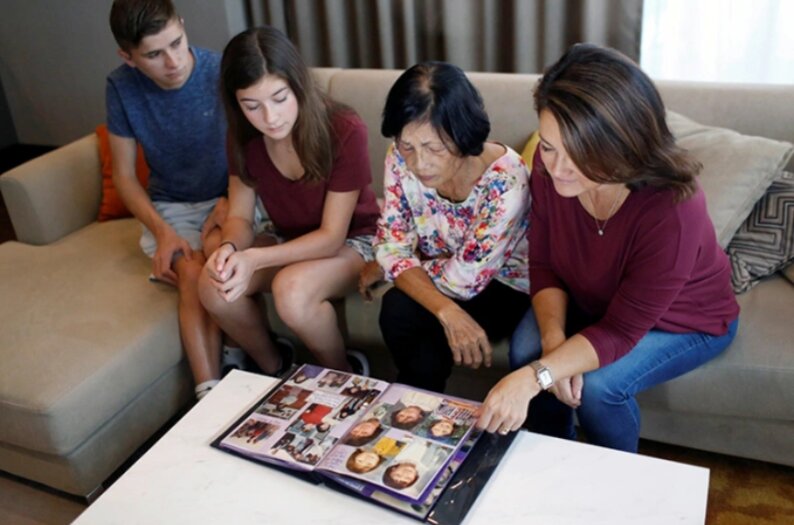 Small cùng hai con và bà Đẹp xem cuốn album ảnh thời thơ ấu cô mang từ Mỹ về tặng bà. Ảnh: Reuters