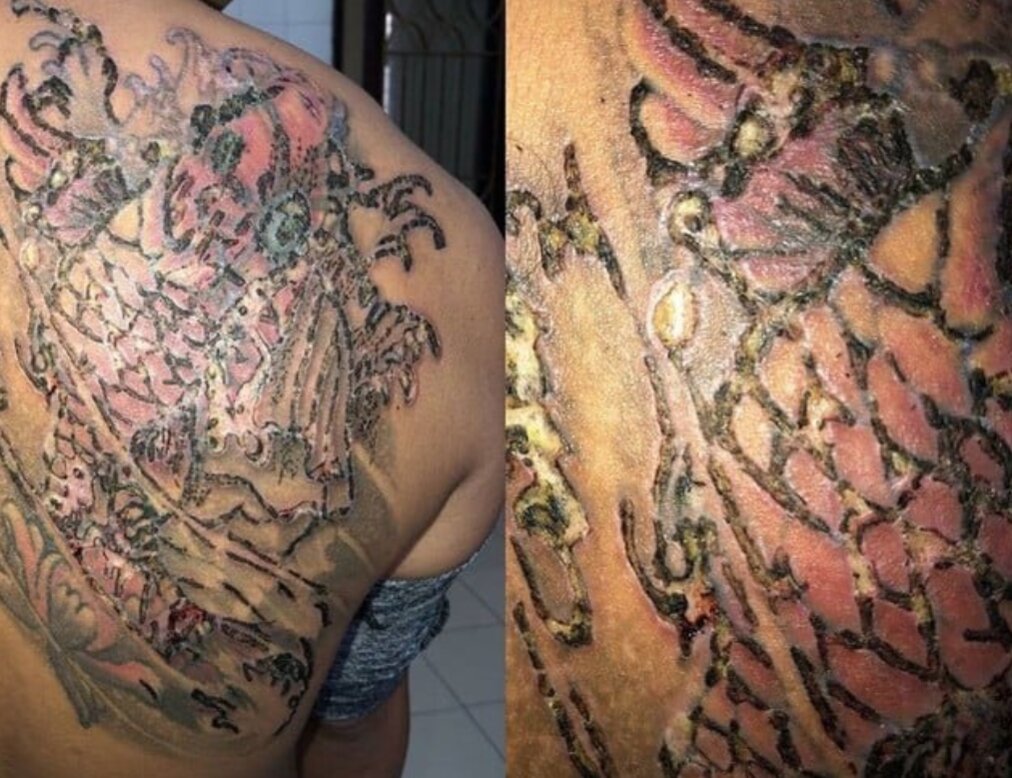Sau khi thực hiện h́nh xăm rồng kín cánh tay tại một tiệm xăm nhỏ tại Hà Nội, nam thanh niên phải đi khám với tổn thương lan rộng, rỉ dịch, ngứa rát do viêm da tiếp xúc kèm nhiễm khuẩn.