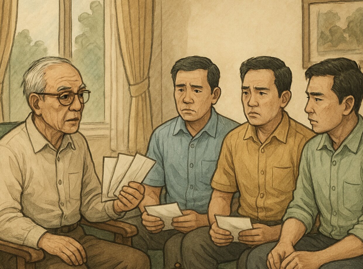 Tôi là Huấn, con trai trưởng trong một gia đình có 3 anh em trai. Dưới tôi là Hưng và Hải, cả 3 chúng tôi đều đã lập gia đình, ra ở riêng, mỗi người một nếp sống. Bố tôi năm nay đã ngoài 70, sức khỏe vẫn ổn, đi đứng chậm chạp nhưng tinh thần thì tỉnh táo lắm. Ông là người sống rất nguyên tắc, chuẩn chỉ, không thiên vị ai nhưng cũng… kín tiếng đến mức khó đoán.