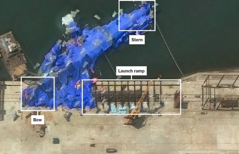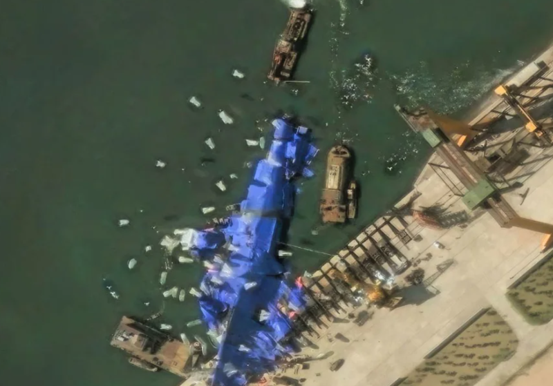 H́nh ảnh vệ tinh cho thấy những vật thể giống như những quả bóng bay màu trắng đang trôi nổi phía trên tàu chiến Triều Tiên bị hư hại sau một lần hạ thủy không thành công, tại Chongjin, Triều Tiên, vào ngày 24/5/2025. Ảnh: Maxar Technologies