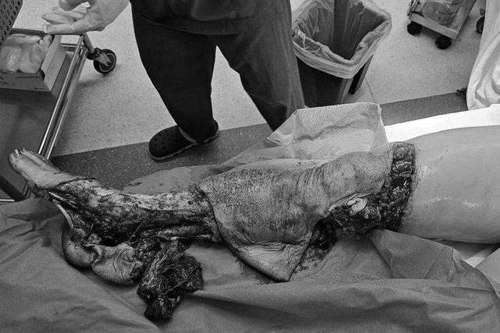Cụ thể, nữ bệnh nhân N. T. N (66 tuổi, ngụ tại huyện Hóc Môn) bị xe tải cán qua chân phải gây vết thương hở phức tạp vùng đùi, cẳng và bàn chân.