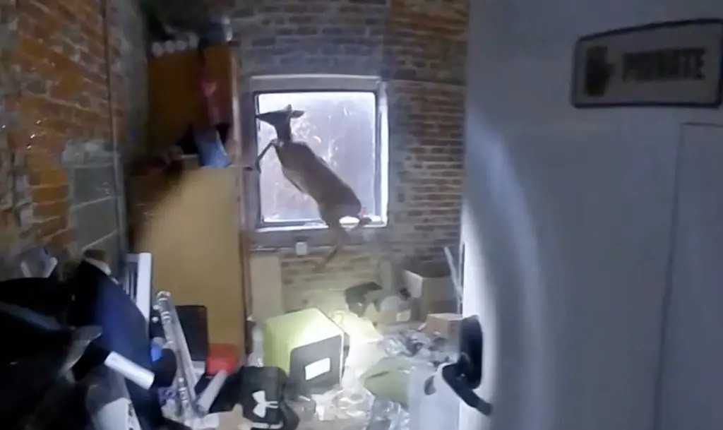 Chú nai tiếp tục va vào các đồ đạc trong tiệm và cố gắng nhiều lần đập đầu vào một cánh cửa kính đã đóng kín để thoát ra ngoài, tạo nên khung cảnh hỗn loạn như trong phim hành động.