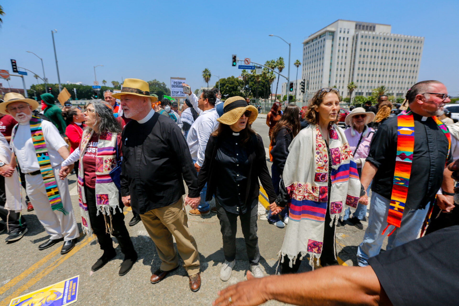 Người biểu tình nắm tay nhau đứng hát nhà tù ở trung tâm Los Angeles, California, ngày 9/6/2025. (Ảnh: BENJAMIN HANSON/Middle East Images/AFP/Getty Images)