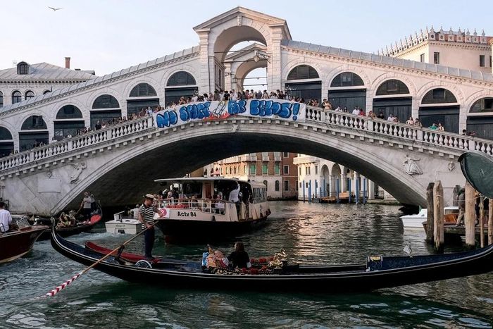 Những người biểu tình giăng biểu ngữ "No space for Bezos" (tạm dịch: Không có chỗ cho Bezos) trên Cầu Rialto. Ảnh: Manuel Silvestri/Reuters.