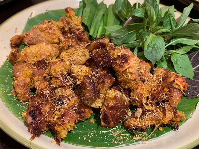 Thịt lợn đen, thường nuôi ở các nông trại có nguồn gốc rõ ràng, thái miếng nhỏ và nướng đến khi vàng ươm và mềm mại. Những miếng thịt còn da giòn tương phản với phần thịt mềm, trong khi riềng và gừng mang đến hương vị nổi bật nhưng lại không lấn át vị ngọt của thịt, mùi thơm của khói. Thực khách sẽ dùng cùng rau thơm, để cân bằng vị.