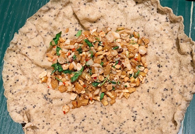 Đây là một trong những món nổi bật của nhà hàng, kết hợp bánh tráng mè đen giòn rụm, đậu phụ và nấm thái nhỏ xào cùng củ đậu, húng quế, đậu phộng, tỏi và ớt. Kết cấu đa dạng đem đến hương vị cân bằng gồm vị cay nhẹ từ ớt và thơm của húng quế, đậm đà và củ đậu, ngọt ngào của đậu phộng nhằm tăng thêm chiều sâu cho món ăn. Đầu bếp kiểm soát nhiệt độ khéo léo giúp từng nguyên liệu nổi bật.