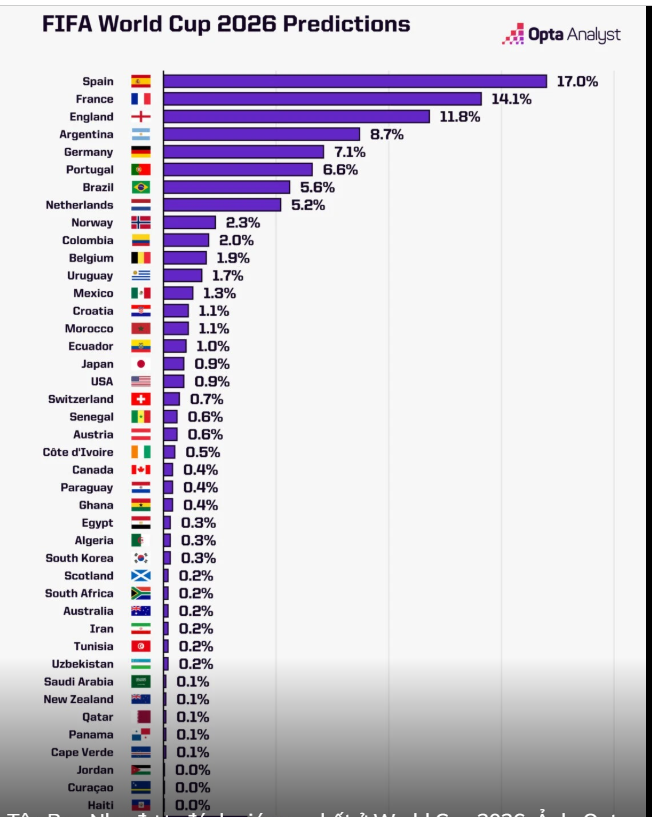 Từ trước khi lễ bốc thăng diễn ra, theo mô hình dự đoán của Opta, Tây Ban Nha là đội có khả năng cao nhất đăng quang World Cup 2026.