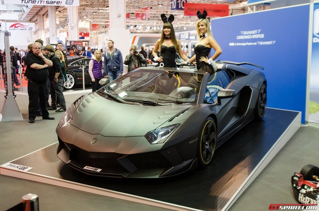 Ở một gian hàng khác, chiếc Lamborghini Aventador Carbonado Roadster được độ bởi Mansory đứng chễm chệ ngay trên bụng H&R với những chi tiết bằng sợi carbon đặc biệt và thân xe được làm lại, giúp xe nổi bật hơn bao giờ hết.