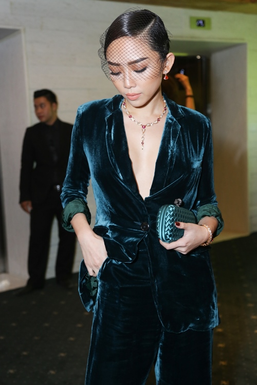 Tóc Tiên với phong cách cổ điển nhưng mang hơi hướng của sự hiện đại, mái tóc ngắn và cách makeup nhẹ nhàng giúp cô trông càng yêu kiều và vương giả. Chọn bộ suit bằng chất liệu nhung, của NTK Đặng Hải Yến. Nữ ca sĩ rất nổi bật nhưng không bị over. (Ảnh: Lê Huy)
