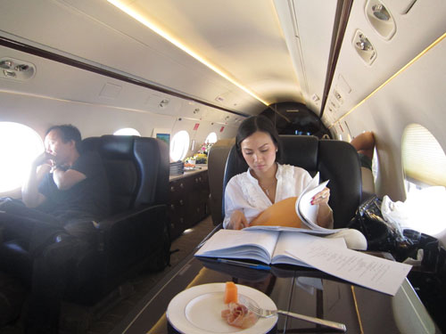 Vợ chồng Chính Chu - Hà Phương trên máy bay của gia đình.