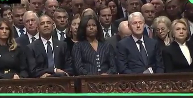 Sự hiện diện của tổng thống Mỹ đương nhiệm Donald Trump tại tang lễ của cựu tổng thống George H. W. Bush dường như đã "phá hỏng" bầu không khí của các tổng thống đảng Dân chủ cùng các cựu đệ nhất phu nhân - những người cười nói và trò chuyện chỉ ít phút trước đó.