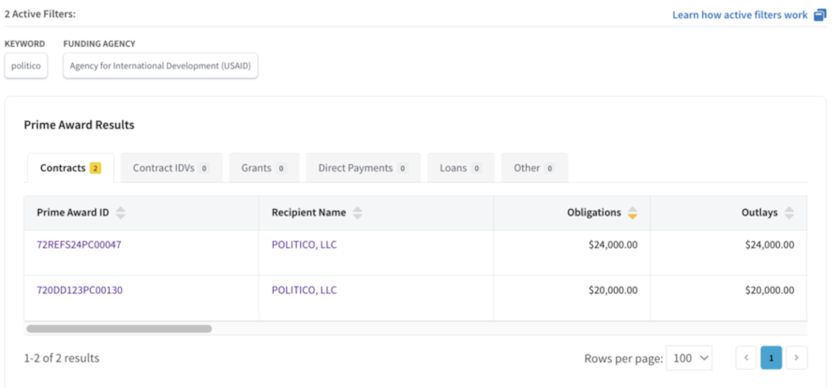 Did USAID spend over $8 million on Politico, LLC, as social media posts imply? No, that's not true: The government spending database only shows $44,000 in two transactions. Both were subscriptions, not grants.