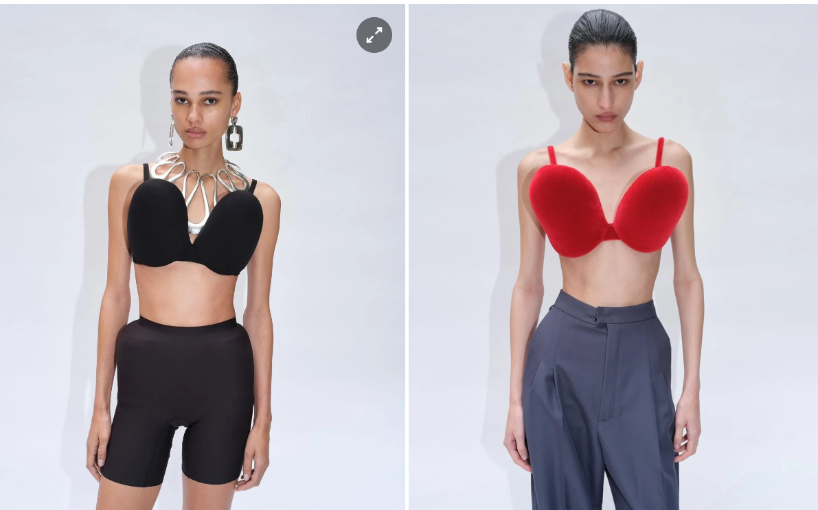 Trong bộ sưu tập Xuân/Hè 2025, thương hiệu Duran Lantink giới thiệu 2 phiên bản áo ngực siêu thực màu đen và đỏ, thu hút sự chú ý của giới mộ điệu. Ngoài ra, nhiều thiết kế mang màu sắc phóng đại, trừu tượng cũng xuất hiện trên đường băng của nhà mốt. Trang phục làm phồng các bộ phận khác trên cơ thể như hông hay vai cũng cho thấy sự sáng tạo, yếu tố hài hước trong thời trang mà nhà mốt muốn truyền tải. Duran Lantink liên tục thách thức sự cân bằng hình thể, coi các bộ phận trên cơ thể người là nguồn cảm hứng thiết kế. Ảnh: Duran Lantink.