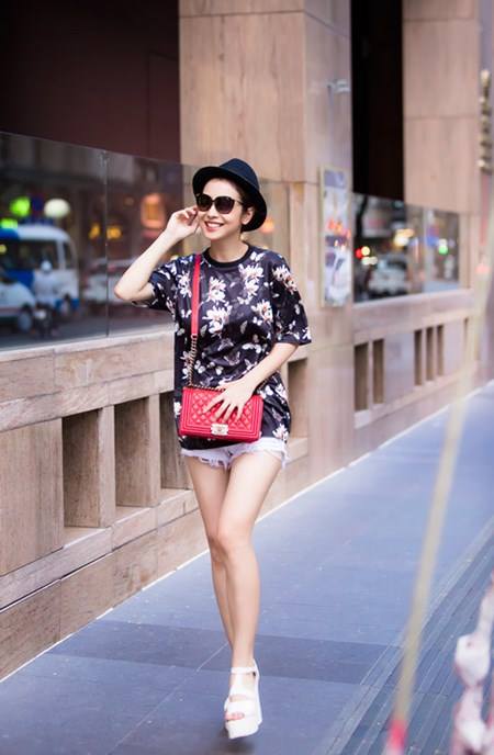 Cô diện mốt "quần biến mất" khoe chân dài dạo phố. Túi xách màu sắc giúp nổi bật trang phục.