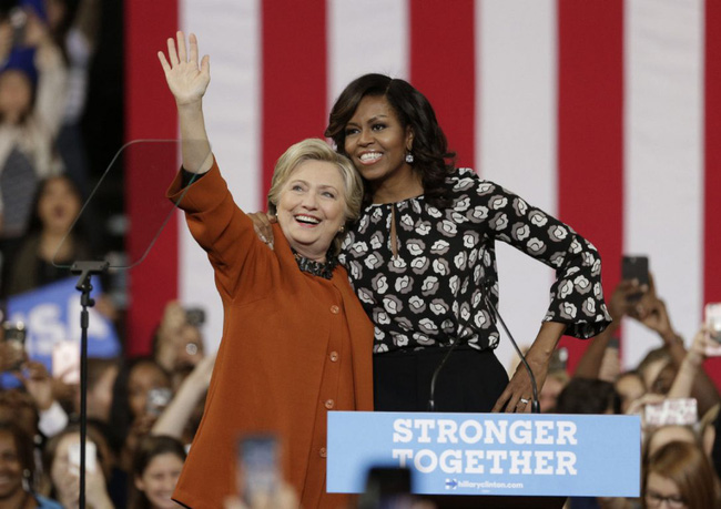5. Trong chiến dịch tranh cử hồi tháng 10, bà Obama đã chọn sơ mi với quần tây khi xuất hiện cùng bà Clinton: