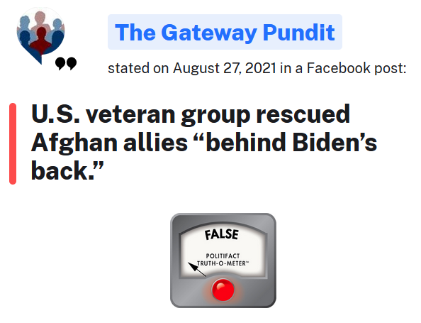 A headline on the conservative website Gateway Pundit claimed that American veterans rescued people in Afghanistan without the knowledge of President Joe Biden, stating: