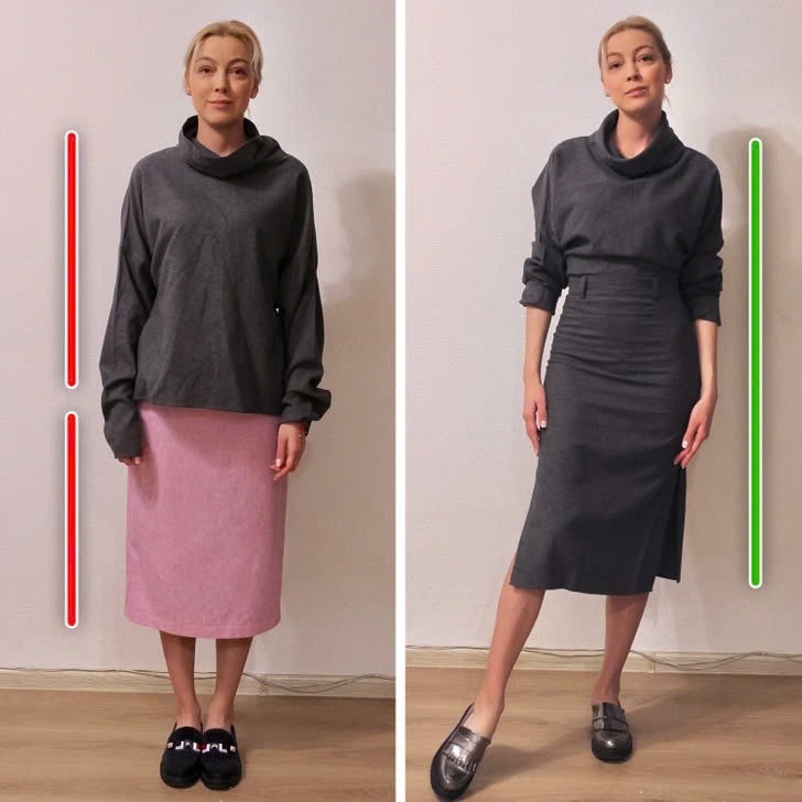 Một chiếc áo len rộng có thể trông luộm thuộm và che mất vòng eo của bạn bằng cách tạo ra ảo giác về phần thân dưới ngắn hơn. Để khắc phục điều này, hãy thử thêm thắt lưng, như minh họa trong hình, để thắt chặt áo len ở eo. Sự điều chỉnh đơn giản này sẽ giúp định hình dáng người bạn và tạo vẻ ngoài dài hơn, cân đối hơn.